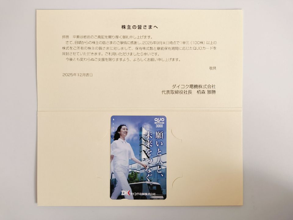 ダイコク電機 (6430)より株主優待が到着しました。