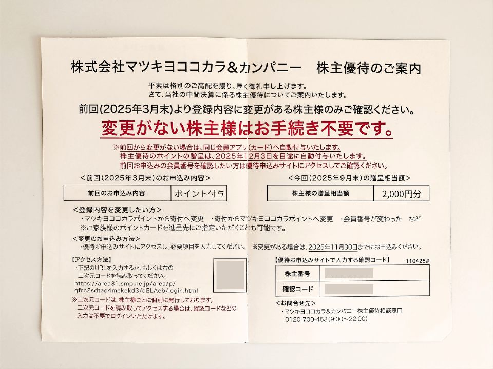 ホーム投資・株主優待株主優待到着 マツキヨココカラ&カンパニーの株主優待到着 2025年11月7日 日経終値:50,276.37円前日比:-607.31円(-1.19%)マイPF:+0.59% PR 2,000円分のポイント♪ マツキヨココカラ&カンパニー (3088)より株主優待が到着しました。 【11月6日到着】 2,000円分のポイントをいただきました。 ありがとうございます🥰 PR 最後までお読みいただきありがとうございました。ブログランキングに参加しています。